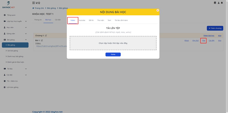 Trên popup Nội dung bài học, click vào tab Video để tải file mp4 làm nội dung bài học.