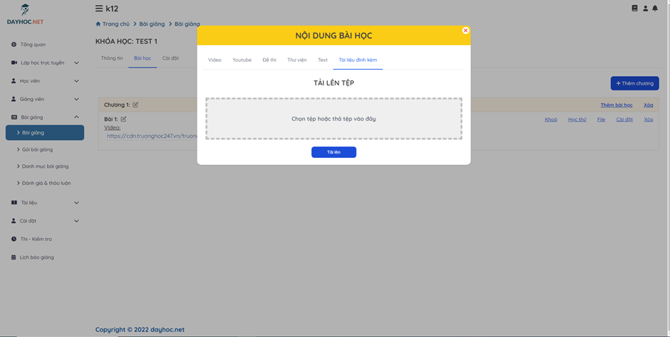 Trên popup Nội dung bài học, click vào tab Tài liệu đính kèm để tải file tài liệu đính kèm vào bài học.