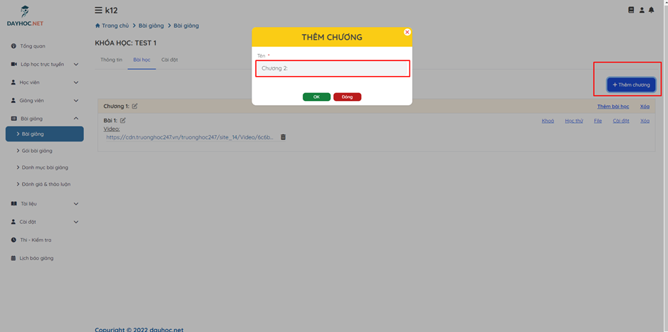 Bước 5: Tại màn hình Danh sách chương bài, click vào nút "Thêm chương" để tạo chương mới. Nhập tên chương học → Click OK.