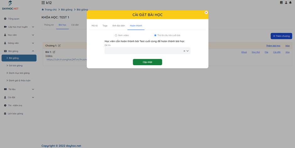 Bước 8: Tại màn hình Danh sách chương bài, click Cài đặt để cài đặt cho bài học.