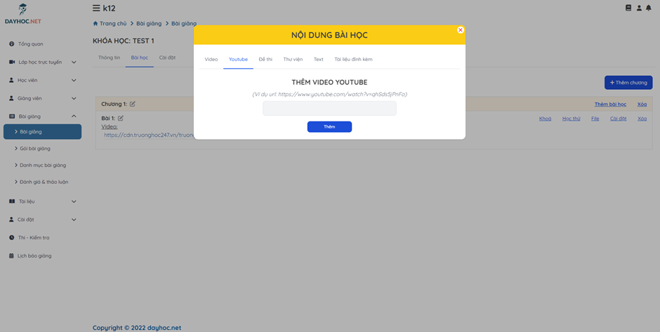 Trên popup Nội dung bài học, click vào tab Youtube để nhập link youtube làm nội dung bài học.