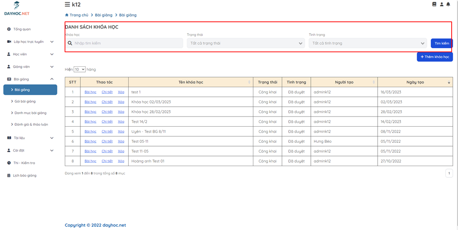 Bước 4: Tại màn hình Danh sách khóa học, click vào Bài học để tạo bài học trong Khoá học.