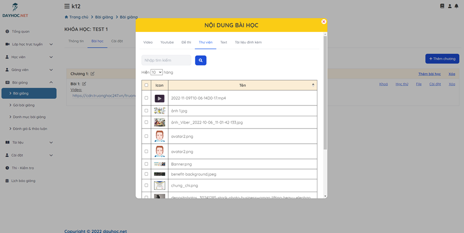 Trên popup Nội dung bài học, click vào tab Thư viện để chọn file từ thư viện làm nội dung bàì học.